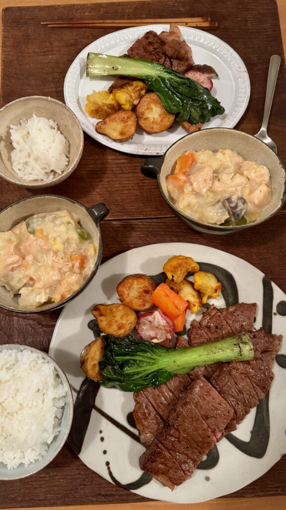 今年のクリスマスに食べたご飯です。サーモンのフリカッセ、黒毛和牛A5のサーロインステーキと焼き野菜です。焼き野菜はニシユタカ(じゃがいも)、赤かぶ、オレンジカリフラワー、椎茸、人参、ターサイ を使いました。軽く蒸した野菜を予熱したストウブの... -