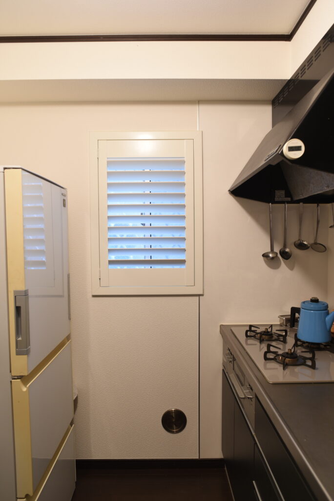 また、このようなガスコンロに近い位置では、ブラインドなども付ける可能性があると思うのですが、油膜の掃除が大変そうです。ウッドシャッターは、掃除をする際、全閉状態にしてから表面をなでるだけなので簡単です。