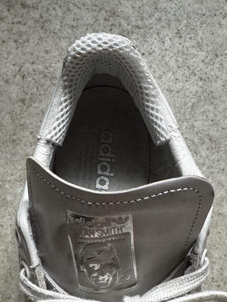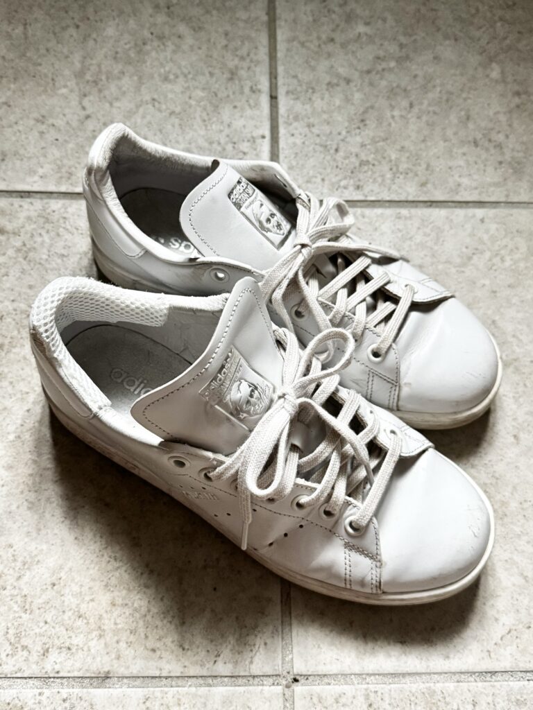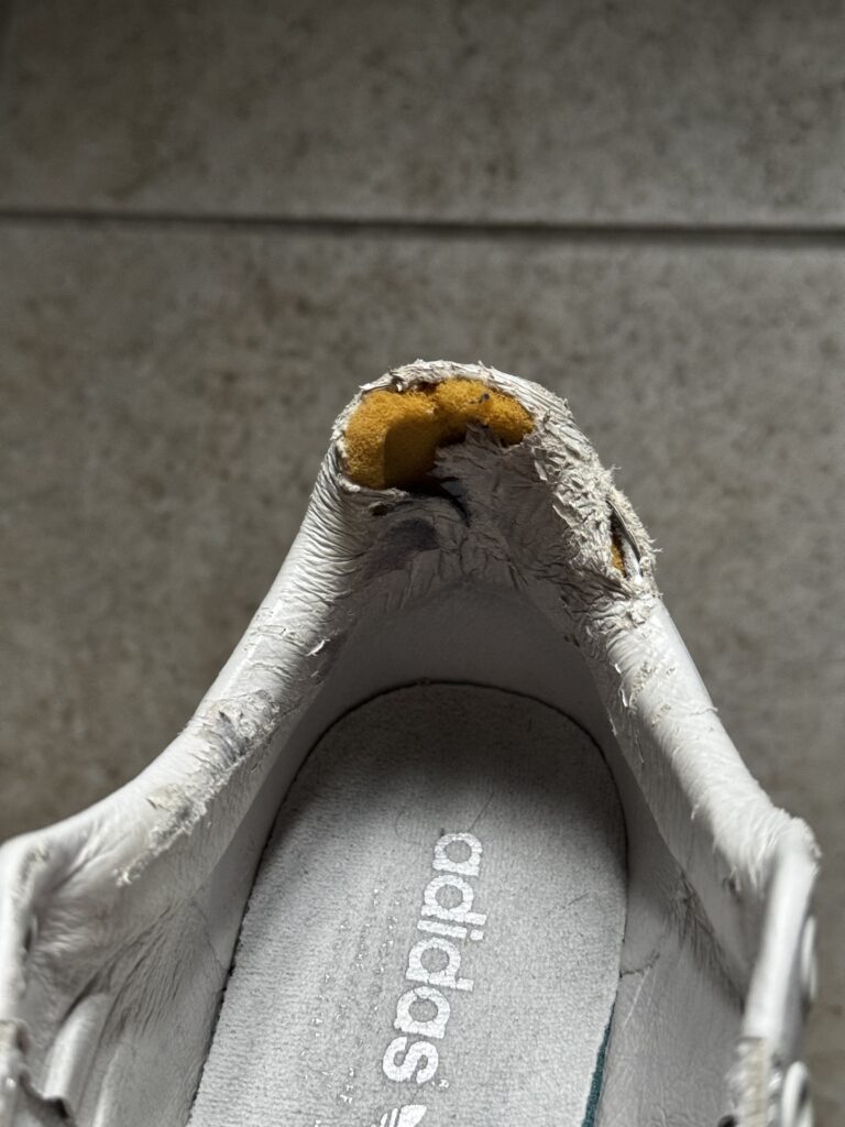 お気に入りのスタンスミス。色は薄いグレーで(白にしか見えないけど)、白すぎずなんとも言えない良い雰囲気で気に入っています。そんなスタンスミスですが、右足のかかとの内側が破れて中のスポンジがむき出しになってしまいました(下左)。
