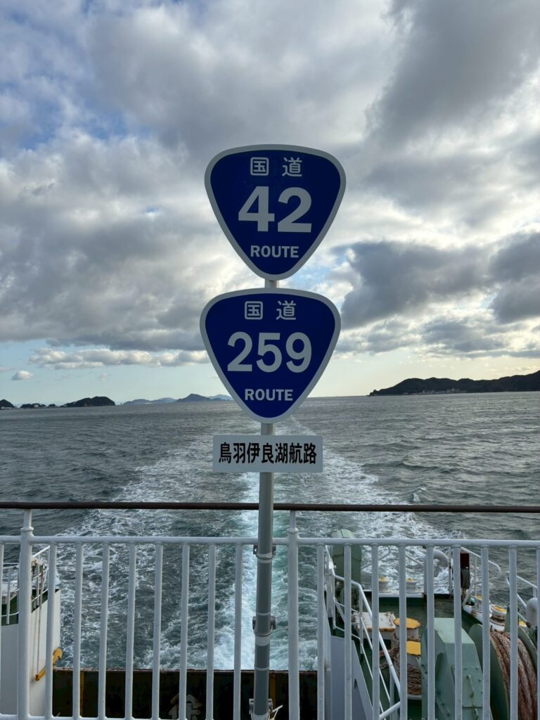 伊勢湾フェリーは、海上国道となっており、甲板に道路標識が掲示してありました。海上国道とは、陸上の国道が海で分断されている場合の海上部分を指します。橋や海底トンネルが無くても、フェリーのような海上輸送機関がある場合はひとつのつながった道路として認められているということです。