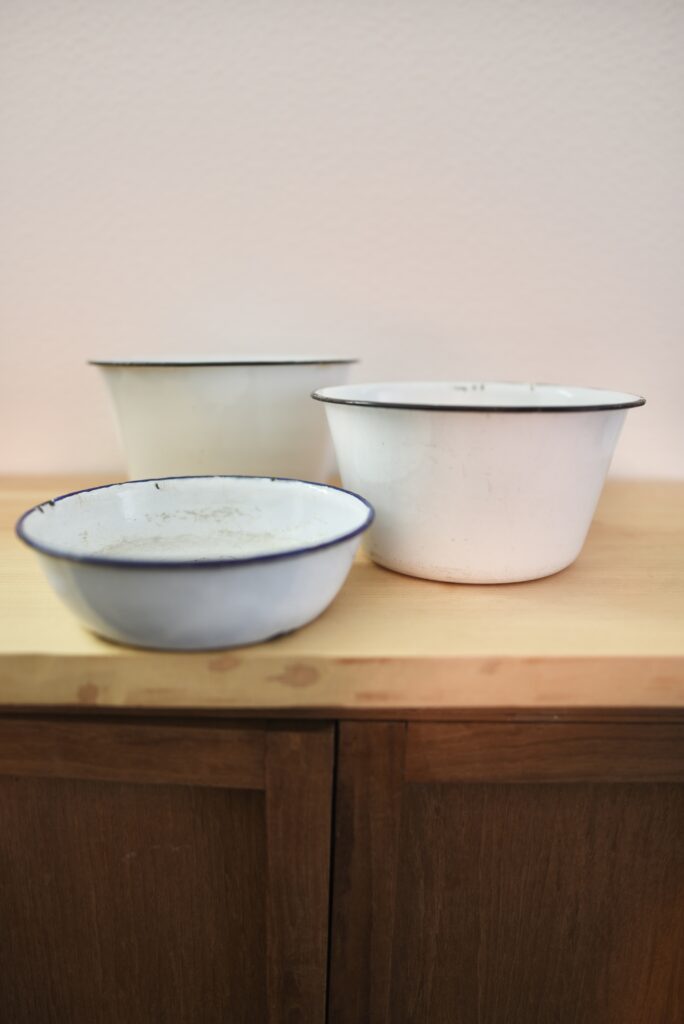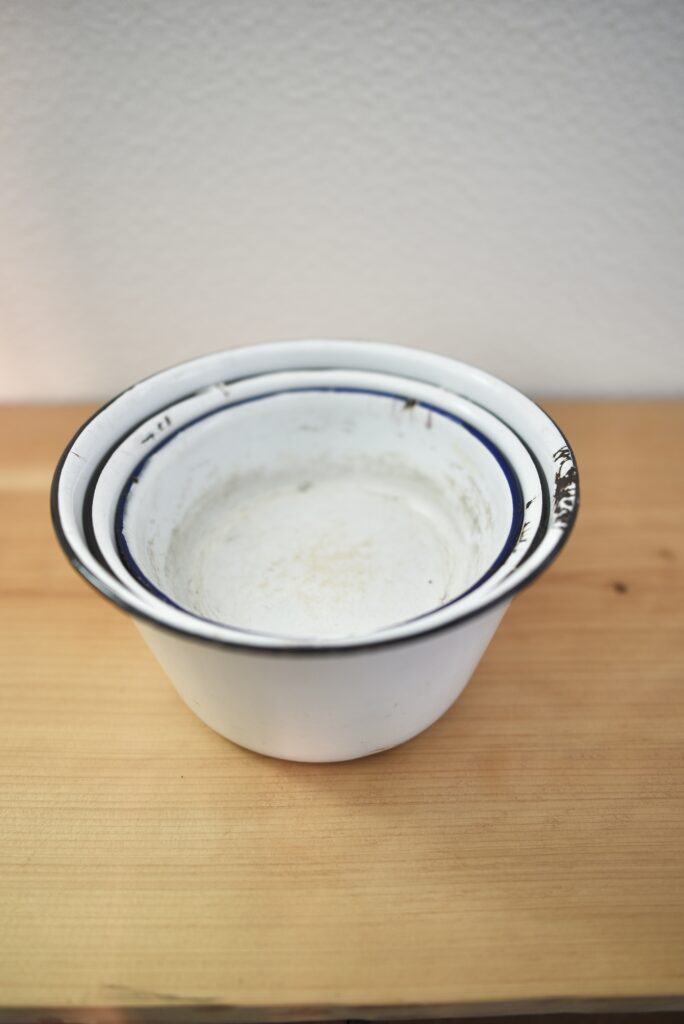 もうひとつは、古いボウルセット。琺瑯(ホーロー)でできています。琺瑯好きには見過ごすことができませんでした。料理の際に、切った食材を分けて入れるのに使います。