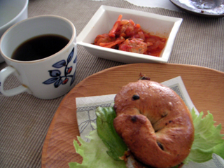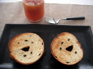 昨夜焼いたカレンズ入りライベーグル、噛みしめるとほんのり甘くておいしかった。さわやかな甘さのいちじくジャムを合わせた。 -