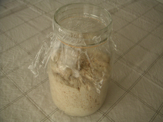 酵母おこしを開始した。 昨夜、酵母エキスに全粒粉と水を入れてこねた。そのまま室温で1.5倍になるまでふくらませ、冷蔵庫の野菜室へ。写真は一晩たった状態。 -