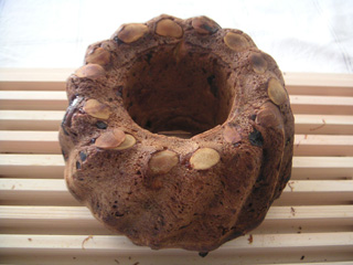 今日、クグロフを焼いた。自家製酵母を使用、小麦粉は「江別製粉ハードブレッド専用粉」。昨夜、いつものレーズン酵母にできたばかりのラ・フランス酵母を少し加えて前種を作り、今日本ごねして焼き上げた。ふっくらしていい香りがしておいしかった。 -