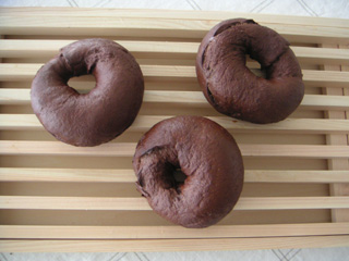 本日はココアベーグルを焼いた。safドライイーストを使用、小麦粉は「春よ恋」。きちっと計ったつもりが、水分量が少なかったので、成形がうまくいかなくていまいちだった。 -
