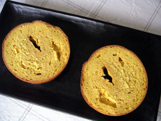 今日はパンプキンベーグルを焼いた。ドライイースト(saf)を使用、小麦粉は「春よ恋」を80%, 全粒分10%, パンプキンパウダー10%。発酵がうまくいったらしく、表面つやつや、中もちもちに焼き上がった。 -