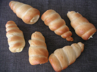 今日、コルネを作った。 成形するとき、前半の生地はまだ緊張していてあまり伸びず、巻きが少なくなってしまった。後半からやっと7巻きとかできるようになった。 結構ふっくらできたと思う。 -