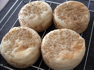 金曜の夜、イングリッシュマフィンを焼いた。 今回は型比容積=3.5で生地量をキッチリ計算した。 体積=3.14×半径5cm×5cm×高さ4cm = 314cc (直径10cm、高さ4cmのセルクルを使用した。) 生地量=体積÷型比容積=314÷3.5=90グラム コーングリッツが無... -