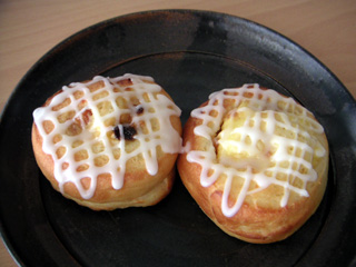 先週の土曜に焼いたスイートロール。 クレーム・パティシエールを作ってフルーツミックスと混ぜ、巻き込んだ。 上からフォンダンも作ってかけた。 甘くて美味しかった。 -