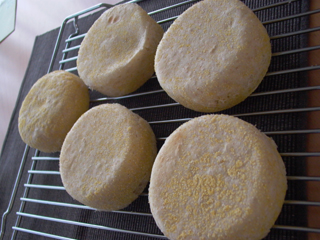 日曜日、イングリッシュマフィンを焼いた。 粉は「1CW」90%, 全粒粉10%。酵母は生イースト。 エアコンを切った室内でホイロした。 1時間位でいい感じに高さが出てきた。 石床を十分に予熱しておいて天板の上にセルクルを並べて窯入れ。 上に銅板をのせた。...