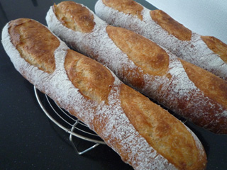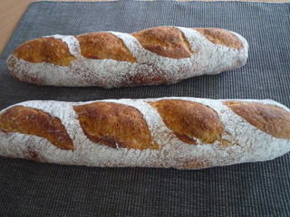 この前焼いたパンです。 粉は「グリストミル」、酵母はホシノのフランスパン用を使いました。 吸水は75%位です。 冷温庫で25℃8時間のフロアタイムの後、分割→ベンチタイム10分→成形→ホイロ20分とおこない、窯入れして230℃10分に加えて210℃17分で焼きました。 クープ... -