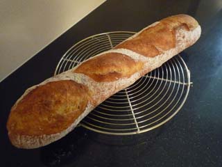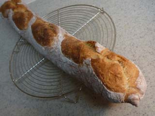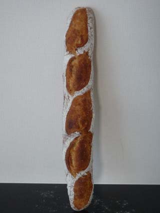 この前焼いたパンです。 粉はタイプER 60%, グリストミル40%で、酵母はホシノの「丹沢」を使いました。 吸水は70%くらいで、生地量は450gでした。 今回も、バゲット1本ぶんだけ成形し、予熱した石床の上に銅板ごとのせて焼きました。 ふくらんだところとふ... -