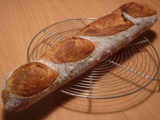 この前焼いたパンです。 粉はタイプERを60%, グリストミルを40%入れました。 酵母はホシノの「丹沢」で、吸水は70%でした。 今回は、生地量を450gと、いつもの半量で仕込み、一本の大きいバゲットに成形しました。窯入れ時には銅板を使いました。 もりもり...