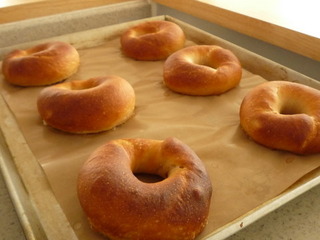 久々の更新となります。 先日焼いたパンです。 粉は1CW, 酵母はホシノビール酵母を使いました。 ダンチュウという雑誌に載っていた、高橋雅子先生のベーグルのレシピを参考にしました。こね上げた記事を一晩冷蔵庫で発酵させてから成形して2次発酵するやり... -