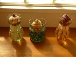 以前からやりたいと思っていたヒヤシンスの水栽培をついにはじめました。 欲張って3つもです。 両側の2つは、ちゃんとしたヒヤシンス用の花瓶を用意しました。 真ん中のは、空き瓶にビー玉を入れてます(テレビでやっていました)。 左側のは、昨日会社に持... -