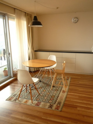 ダイニングのテーブルの下にキリムを敷くことにしました。 オールドキリムで、いろいろ探し回った末に購入しました。 優しくてかわいらしい感じの模様が気に入りました。 テーブルといすがすっぽりおさまるちょうど良いサイズなのも決め手になりました。 ... -
