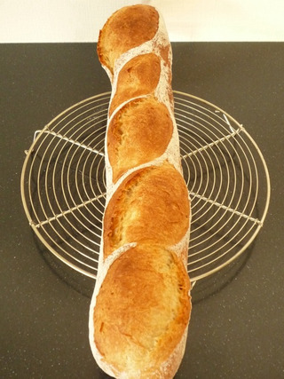 土曜日に焼いたバゲットです。粉はタイプER 60%, 1CW 40%, 酵母はホシノ丹沢フランスパン酵母を8%使いました。給水は60%位でした。 前々日夜から野菜室で生地を発酵させ、前日の夜、室温に出して一晩発酵させ、朝に焼き上げました。二次発酵は冷蔵庫で30分... -