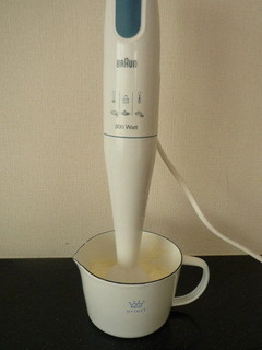 私の大好きなBRAUN マルチクイックは、生クリームの泡立ても得意です。 底の平らな500mlのホーロージャグに生クリームを100mlほど入れ、お砂糖を大さじ1杯加えたらマルチクイックでまぜます。ものの10秒でよい感じに泡立ちました^^すごーい。 そば粉のワッ... -