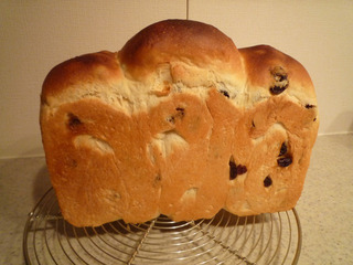 レーズン山食を焼きました。粉はスーパーキング100%, レーズンは50%, 酵母は耐糖性のサフ インスタントドライイースト(金ラベルのもの)を使いました。真ん中の山が高すぎてしまいましたが、よく窯伸びして軽く焼きあがったと思います。 トーストして食べ... -