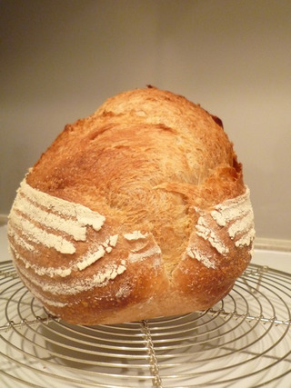 金曜の夜に焼いたカンパーニュです。 窯伸びしすぎて異様な雰囲気^^; 家族みんなでドン引き(-。-; 粉は全粒粉25%, ゴールデンヨット50%, 薄力粉25%, 酵母はsafインスタントドライイーストを0.1%使いました。給水は65%くらいでした。 フードプロセッサーDLC-...