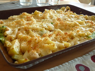 休日の昼食に、冷蔵庫のお掃除も兼ねて、グラチネを作りました。 海老と鶏肉と残り野菜を少量炒めて、それとホワイトソースを作り、パスタをゆでて合わせ、上にチーズとパン粉をかけてオーブンに入れるだけ。本当に簡単です。 たまねぎスライスは時間のあ... -
