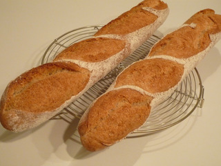 この前焼いたバゲットです。 粉はフランス75%, ライ麦粉25%, 酵母はsafインスタントドライイーストを0.1%使いました。給水は65%くらいでした。 室温で20時間発酵させてますが、そろそろ限界になってきたので、今度からはイーストの量を増やして野菜室行き... -