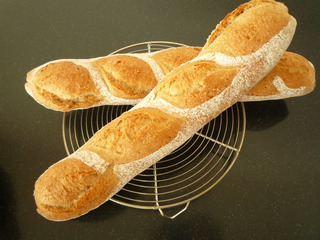 連休中に焼いたバゲットです。粉はフランス88%, ライ麦粉12%, 酵母はsafインスタントドライイーストを0.2%, 給水は65%位でした。 最近、急激に気温が上がってきましたので、バゲットの焼き上がりもだんだん変わってきました。 生地温度が上がると、ベタつ...