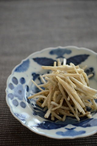 ごぼうサラダを作りました。器は岩永浩さんの花鳥文輪花五寸皿です。 ごぼうサラダに入れるマヨネーズ、最近は手作りしてます。 材料はマスタード・塩・こしょう・白ワインビネガー・卵黄・オイル。 最初に白ワインビネガーの半量とオイル以外をすべて混ぜ...