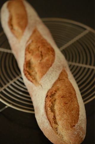 一年ぶりくらいでバゲットを焼きました。 粉はトラディショナル80%, ライ麦粉20%, 酵母はサフ インスタントドライイースト0.2%, 給水は65%くらいでした。 一次発酵は18℃のワインセラーで10時間くらいやって、その後1時間室温に置いてから成形しました。 一... -