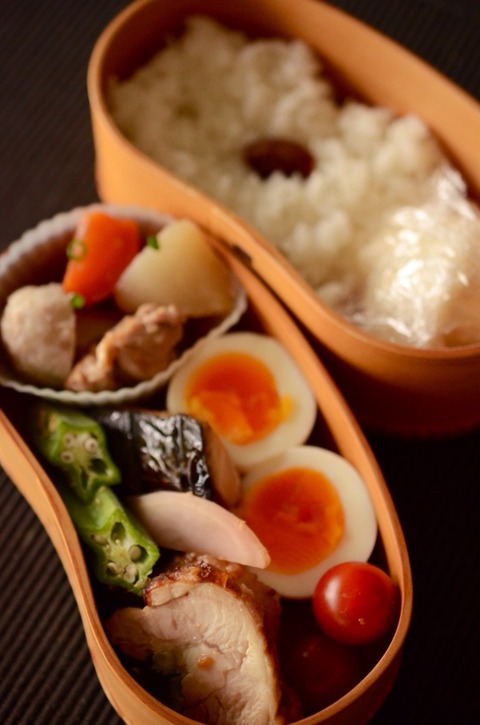 お盆の間帰省していたオットと息子が帰宅し、再びにぎやかになったわが家です。 昨日から、学童お弁当作りの後半戦が始まってます。 筑前煮 半熟卵 鯖柚庵焼 新生姜甘酢漬 鶏もも肉万葱巻 ミニトマト オクラ 白ご飯 自家製梅干 幸水 オクラは義父の菜園で... -