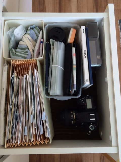 ダイニングのマルチカウンターの引き出しを整理しました。 〈ビフォー〉 エプロン、スーパーのビニル袋、カード・小物類、非常用バッテリー、デジタル一眼レフカメラと取扱説明書とレンズ、ノート、母子手帳、レシート・領収書用のエキスパンディングファ... -