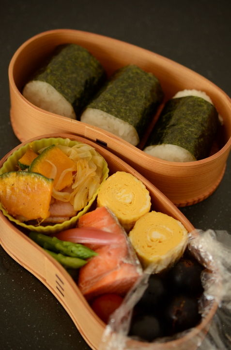 本日は息子が学童お出かけで森林公園へいきました。 南瓜のリヨン風 細巻卵 紅鮭塩焼 酢取り茗荷 アスパラガス ミニトマト 巨峰 焼たらこのおにぎり 夕食は知り合いの日本料理のお店に行くつもりなので、お弁当は軽めにしました。 たらこは...
