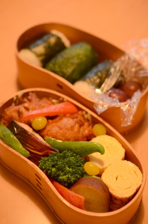 息子の遠足のお弁当を作りました。 鶏唐揚げ 鯖の柚庵焼 細巻卵 パプリカ ピーマン 銀杏 丸十蜜煮 ブロッコリー おにぎり(自家製梅干 焼きたらこ 高菜漬) ピオーネ オットは、高菜漬が大好物です。 新鮮な高菜を横須賀の直売所「すかなごっそ」で見つけ... -
