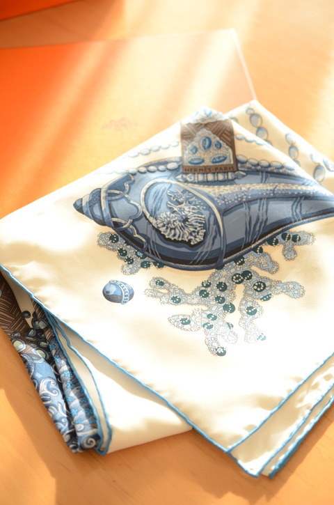 この前、シルクスカーフを初めて買いました。 エルメスのカレです。 白地ベースに青い珊瑚の模様、少しグレーやベージュの入った配色です。 明るく親しみのあるデザインだったので購入に至りました。 ネイビーやライトグレーのシンプルな服装が多いので、... -