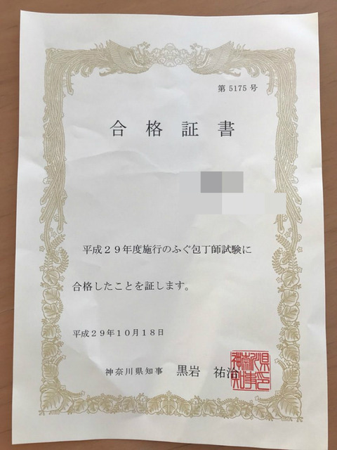 神奈川県ふぐ包丁師試験に合格しました。 →「【速報】合格!神奈川県ふぐ包丁師試験」 合格発表の翌日に、書留で合格証が送られてきました。 それとは別に、県庁まで得点を見に行ってきました。 受験票と身分証明書を持っていけば、県政情報センターで、本... -