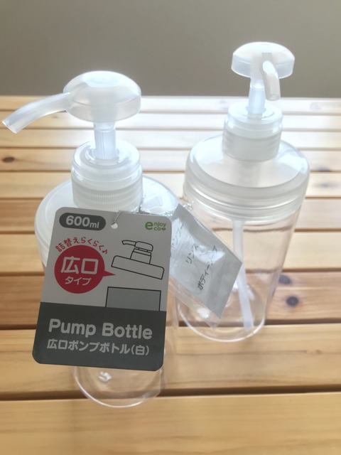 新居の浴室用に、広口のシャンプー・リンスボトルを買い替えました。 100円ショップのセリアのものです。 以前から広口のものを使っていましたが、それはフタが外れやすく、落としてフタが開いた拍子に中身が全部流れてしまったりすることが何回かありまし... -