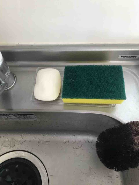 キッチンにて、スポンジと石けんを両方置けて水切りができるシンプルなトレーを買いました。透明なアクリル板に溝があるだけのシンプルな作りです。キャンドゥで買いました。お気に入りのシャボン玉石けんと、スコッチブライトの定番スポンジが置けて便利...