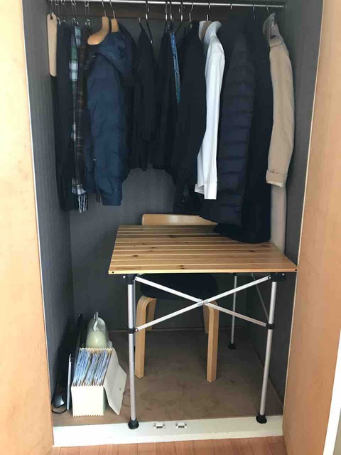 2日に1回くらいのペースで、起床のタイミングで、軽く掃除をします。窓を開けて、羽根ばたきで埃を集め、掃除機をかけ、ぞうきんワイパーで床全体を雑巾がけします。その時に、テーブルが邪魔なので、ご覧の通り、クローゼットにすっぽりと収めてしまいま... -