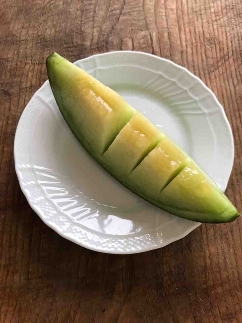 青森県で買って帰った貴味メロン、ちょうど食べごろになったところで切りました。爽やかな芳香、甘み、食感がどれも素晴らしく、夢中になって食べました。海の駅の直売所で500円で買いました。また買いに行きたいです! -
