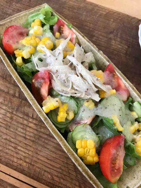 今週の野菜です。にんじん、じゃがいも、長芋、大根、小松菜、長ねぎ、ピーマン、ミディトマト、とうもろこし、しめじリーフレタス、きゅうり、ミディトマト、とうもろこし でサラダを作りました。長芋は叩いてポン酢と和えて、サラダに加えました。ゆで卵...