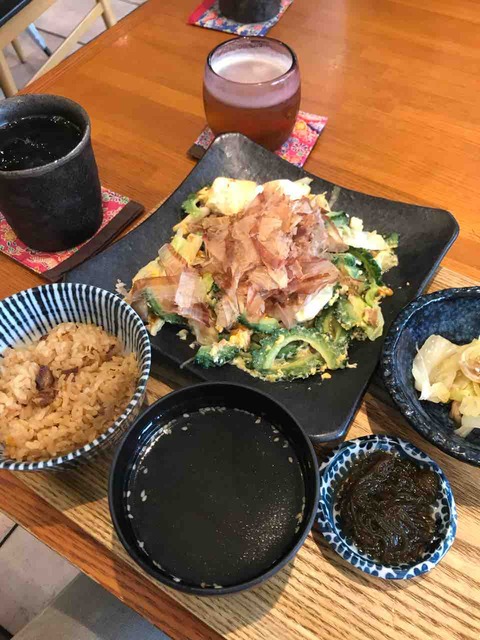 お友達と逗子の「くくる食堂」でランチしました。ゴーヤーチャンプルー定食とランチビールを頼みました。ランチビールは、オリオンでした。もずく酢、シークワーサー味のキャベツの和え物、ジューシー(炊き込みご飯)、それとゴーヤーチャンプルーで980円... -