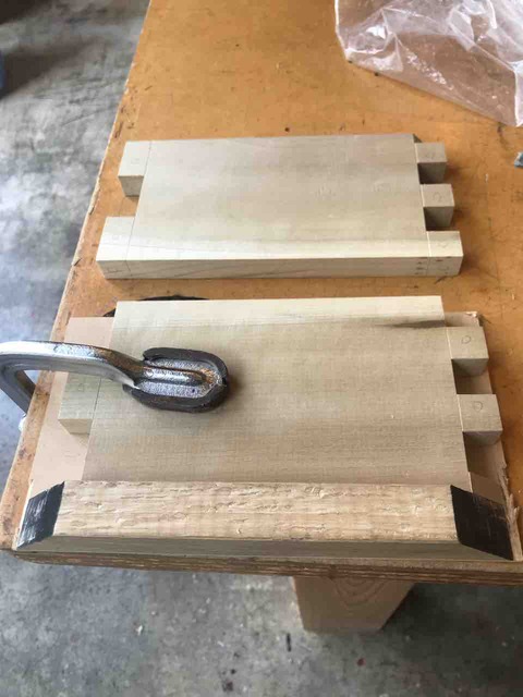 前回の続きです。五枚組の継手の加工をほとんど家で進めて、教室では仕上げをしました。2箇所ある留(とめ、材料を直角に接合する仕口のこと)は、2通りのやり方で仕上げました。まずは、専用の治具を使い、鑿(のみ)で削る方法です。正確に45℃に加工され... -