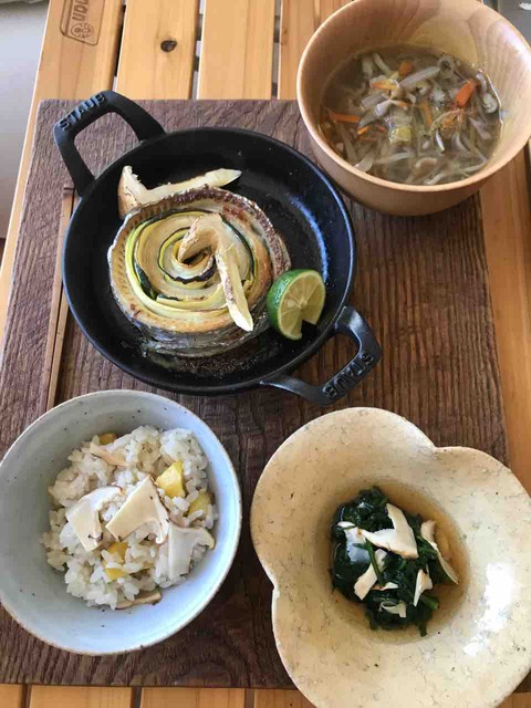 新居に妹が遊びにくるというので、季節の松茸を食べさせてあげたいと思い、献立を立てました。先附春菊と松茸のお浸しお椀沢煮椀 胡椒焼物太刀魚とズッキーニのロール巻き焼き松茸 酢橘強肴黒毛和牛のローストビーフ食事松茸と栗と鶏の炊き込み御飯デザー... -