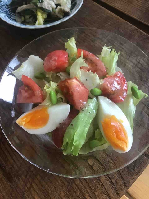 先週の野菜です。たまねぎ、にんじん、さつまいも、レタス、ほうれん草、にら、ししとう、枝豆、トマト野菜がだぶついていたので、今週のぱれっとはお休みして、冷蔵庫整理しました。レタス、トマト、枝豆、ゆで卵 でサラダを作りました。合挽肉、な... -