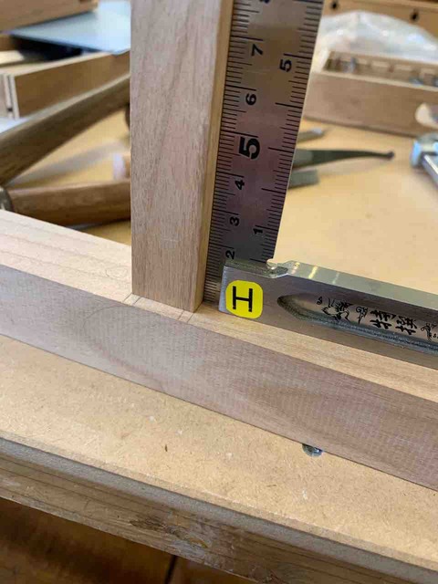 久々の木工教室です。側貫(がわぬき、脚の真ん中くらいに渡す補強のための横木)のホゾの調整をしました。脚のホゾ穴に側貫のホゾをはめた状態です。ここから、側貫のはめ合いのカネ(垂直)、ねじれなどをチェックして調整しました。側貫のホゾは全部で4... -