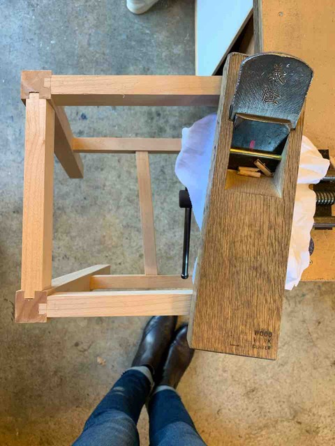 またも、木工教室です。座板が乗る、脚と幕板が組まれた部分に鉋をかけ、平坦度を高めました。平らな定規を当てて、高低差がないか厳密に確認しました。定盤の上に乗せてみて、ガタつきがなかったので上の部分は合格しました。続いて、補強のための隅木を...