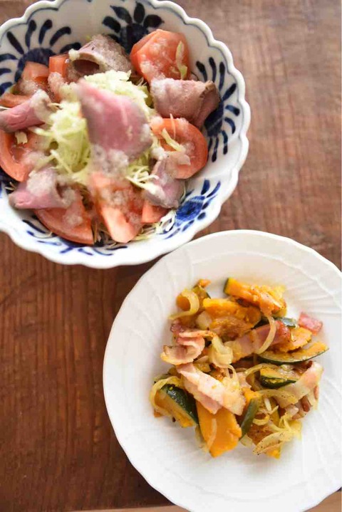 先週の野菜です。白菜、葉ねぎ、じゃがいも、にんじん、さつまいも、大根、小松菜、トマト、なす、えのきだけ残り野菜もたまってました。玉ねぎ、かぼちゃ、ベーコンでバター炒めを作りました。真空低温調理器でローストビーフを作り、キャベツ、トマト で... -