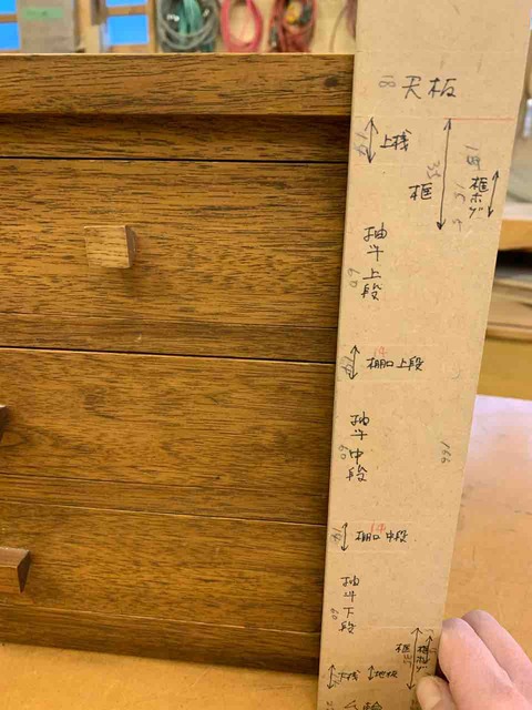 木工教室の最終課題に入りました。それは小抽き出しと言うもので、早速、作業に入りました。抽き出しが3段計4個あり、縦方向に部材が積み重なるため、「盛りつけ棒」という、縦方向のみの寸法を取り出した木の棒を作りました。盛りつけ棒があれば、寸法の...