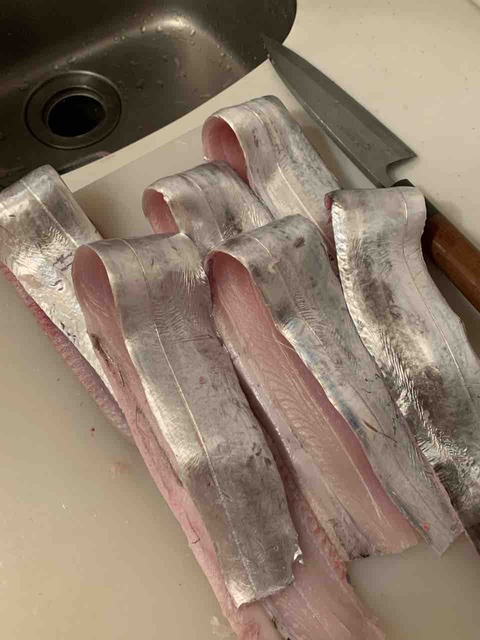 お友達が、太くて立派な太刀魚をたくさん釣ってきたというので、卸しのお手伝いをしました。ふつう太刀魚といったら、骨ごとぶつ切りにして売られていると思いますが…。ちゃんと三枚に卸すと、骨を気にせず思い切り味を楽しめます。小骨の心配を一切しない... -