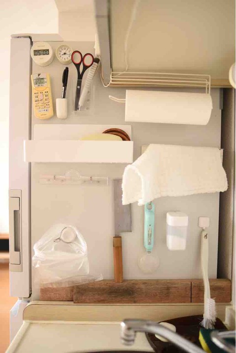 キッチンシンクの左側、冷蔵庫の右側面を細々とした収納に活用しています。毎日手に取るものはマグネット収納を使い、限界までこの壁面に詰め込むようにしています。 キッチンタイマー時計エアコンのリモコンハサミ、カッター、油性ペンキッチンペーパーコ... -